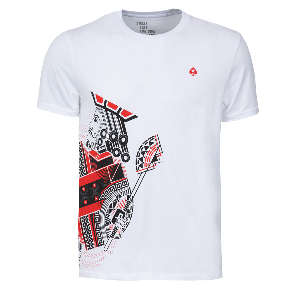 Show who the real king of the table is with this t-shirt. A stylish plain white tee is given the royal treatment with a playing card king design across the side and front. The t-shirt is unisex and medium fit.