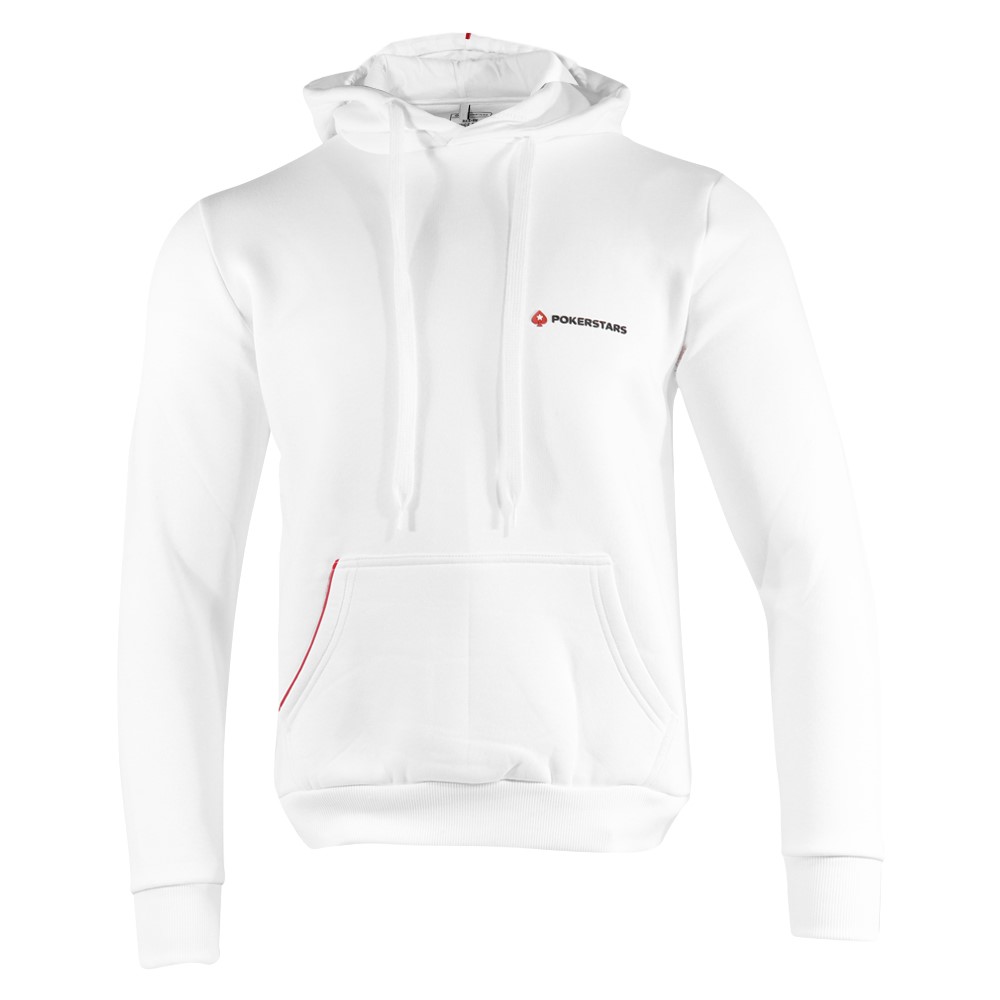 Esta camisola com capuz branca inclui um pormenor vermelho no lado direito do bolso da frente e um fio vermelho elegante ao longo da parte de trás da camisola. Com um acabamento em tecido cardado para não ter frio e o famoso logótipo da PokerStars para garantir que se destaca no meio da multidão, este é o presente ideal para um amante de poker. Inclui estampados coloridos discretos no interior da gola e ao longo do fundo das costas.